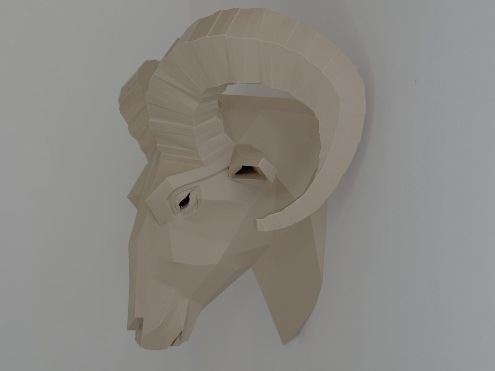 The Low Poly Ram Wall Head is a modern geometric wall sculpture featuring the powerful curved horns of a ram in a sharp faceted design. 3D printed with clean angular lines, it creates a bold statement piece for contemporary interiors.