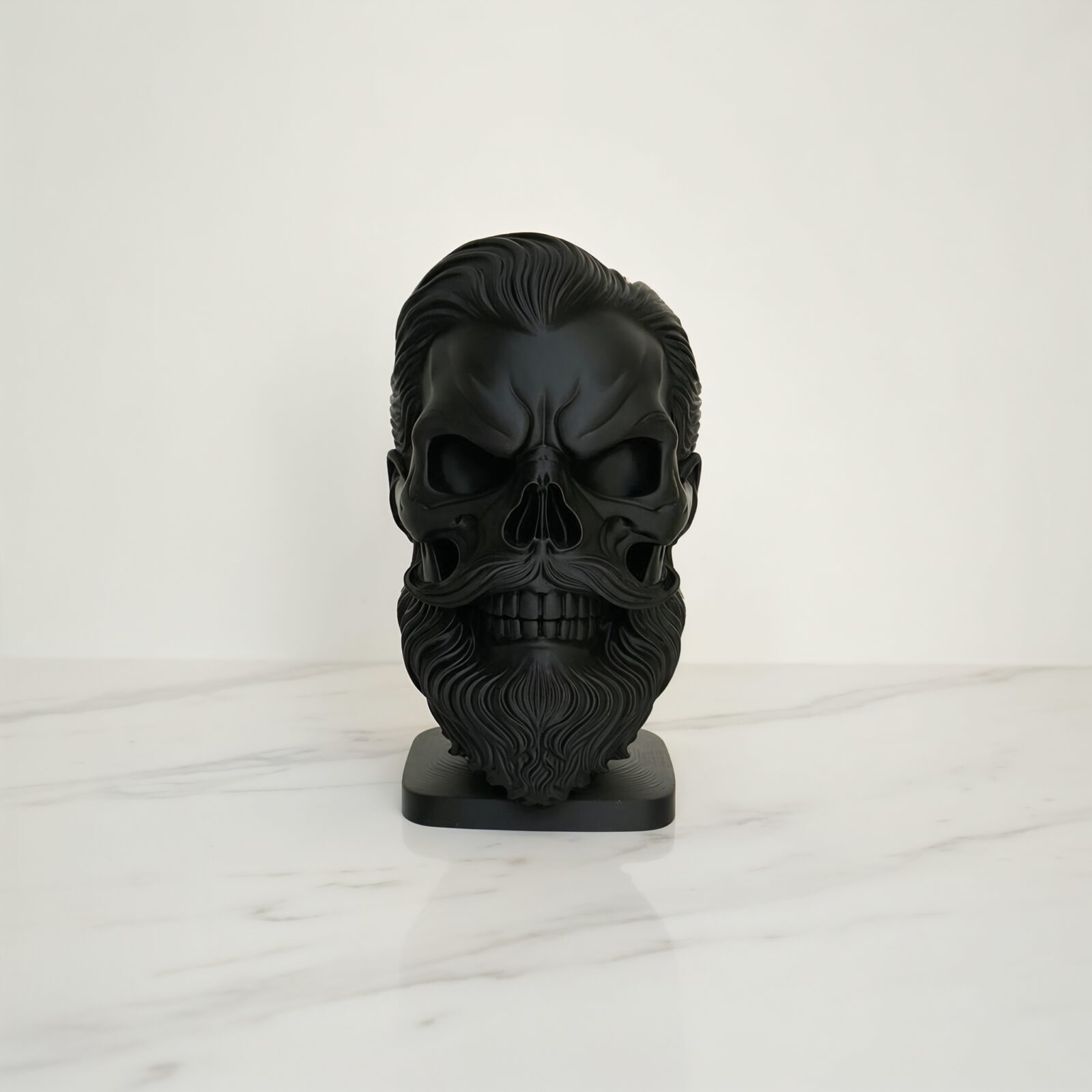The Old School Skull Bust blends classic skull imagery with vintage barber-style aesthetics, featuring a sculpted pompadour hairstyle and detailed beard. This unique decorative piece brings attitude and personality to any space, making it perfect for modern interiors, offices, studios, or man caves. Each bust is 3D printed to order, capturing fine details in the hair, beard, and skull structure while maintaining a smooth, matte finish. Display it on a desk, shelf, console table, or side table to create a bold visual focal point.